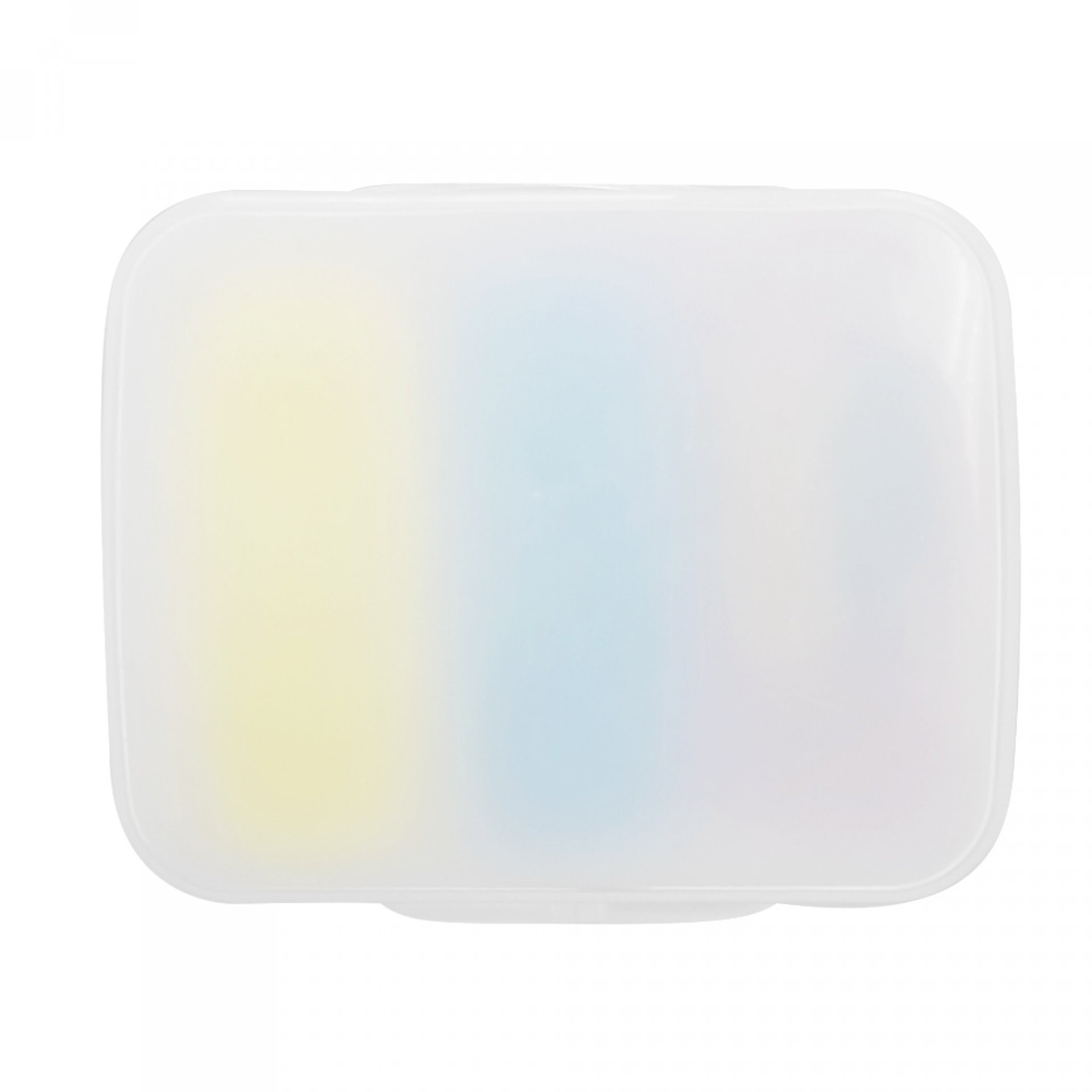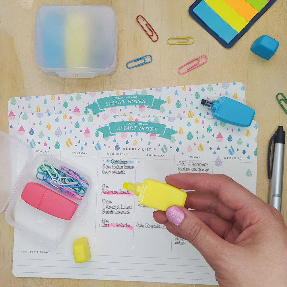 Con dos mini resaltadores de cera y clips multicolores en caja plástica. Caja: 7.9 x 6.8 cm. Resaltador: 5.5 x 2 cm.